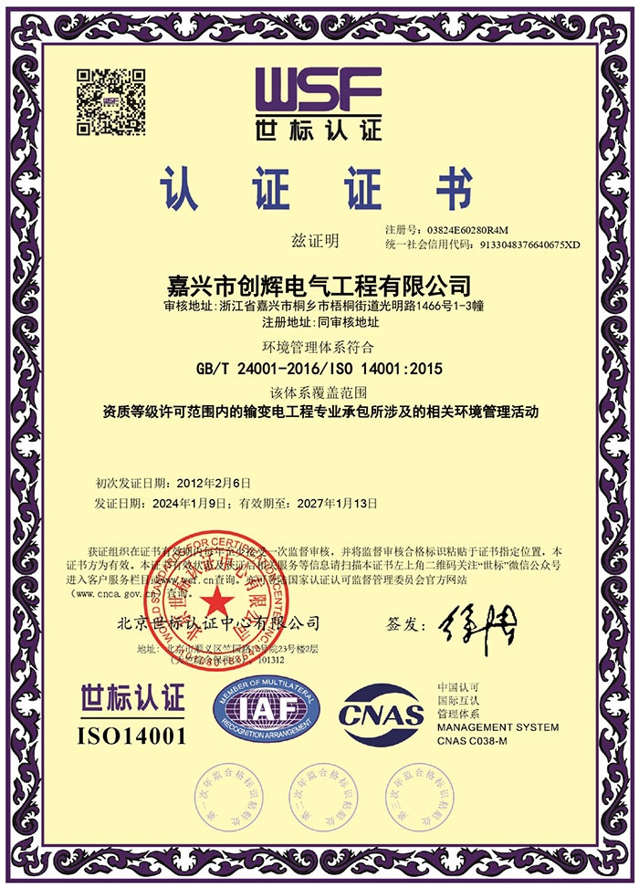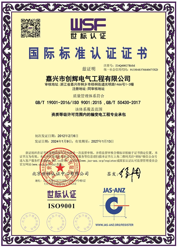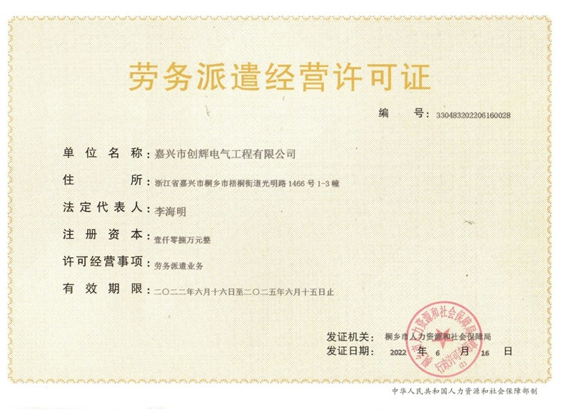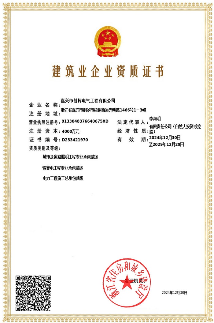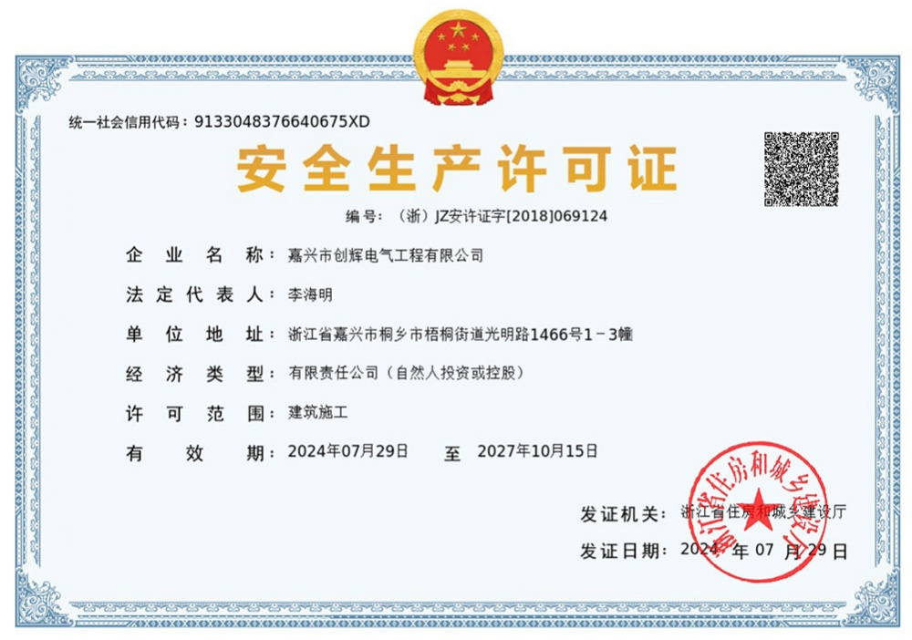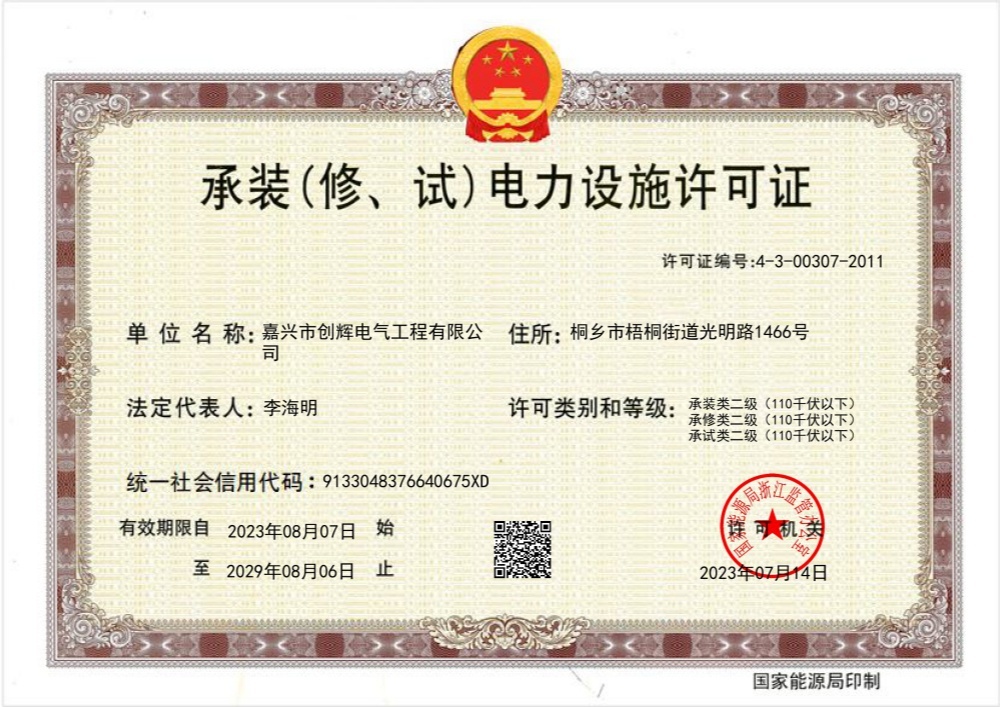 嘉興市創(chuàng)輝電氣工程有限公司,總部坐落于浙江桐鄉(xiāng)經(jīng)濟開發(fā)區(qū),公司成立于2004年,是一家承接高、低壓輸變電工程施工安裝、維修的企業(yè)。公司下設(shè)人事行政部、預(yù)結(jié)算部、采購部、財務(wù)部、營銷部和工程部等,其中工程部根據(jù)具體作業(yè)內(nèi)容分設(shè):變電項目部(12個班組)、線路項目部(6個班組)?,F(xiàn)有員工500余人,其中擁有一級建造師3名,二級建造師15名,高級工程師1名,工程師36名,助理工程師52名,高壓電工240余名。目前我公司已具備電力工程總承包貳級資質(zhì),輸變電工程專業(yè)承包貳級資質(zhì),城市及道路照明工程專業(yè)承包貳級資質(zhì),承裝(修、試)電力設(shè)施許可二級資質(zhì),建筑施工安全生產(chǎn)許可,是浙江省高新技術(shù)企業(yè)、省AAA級“守合同重信用”企業(yè)。